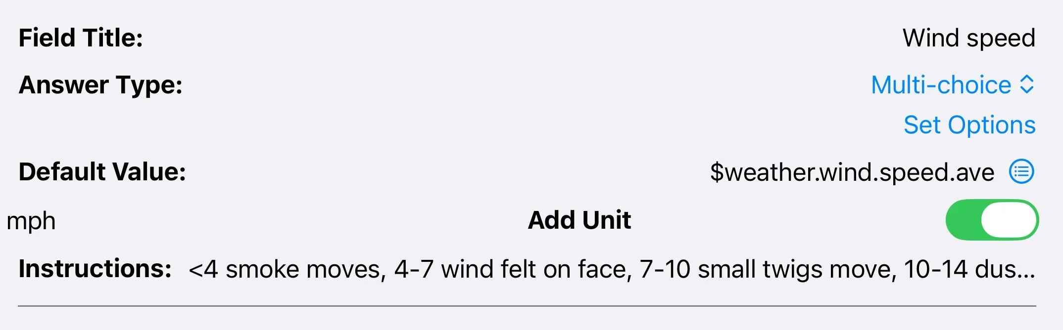 Example Log Field with Default set to an AutoValue. Notice that this Log Field uses a predefined set of choices commonly found on K9 paper logs. Lokate will compute the average wind speed during the assignment and then select the wind range this value falls into.